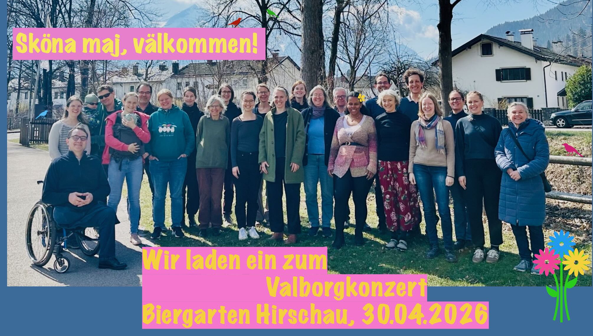 30 april 2026, från kl.18.00: Fira Valborg med oss och välkomna våren med glada sånger i Biergarten Hirschau, Gyßlingstraße 15, i den norra delen av Engelska trädgården, 80805 München.